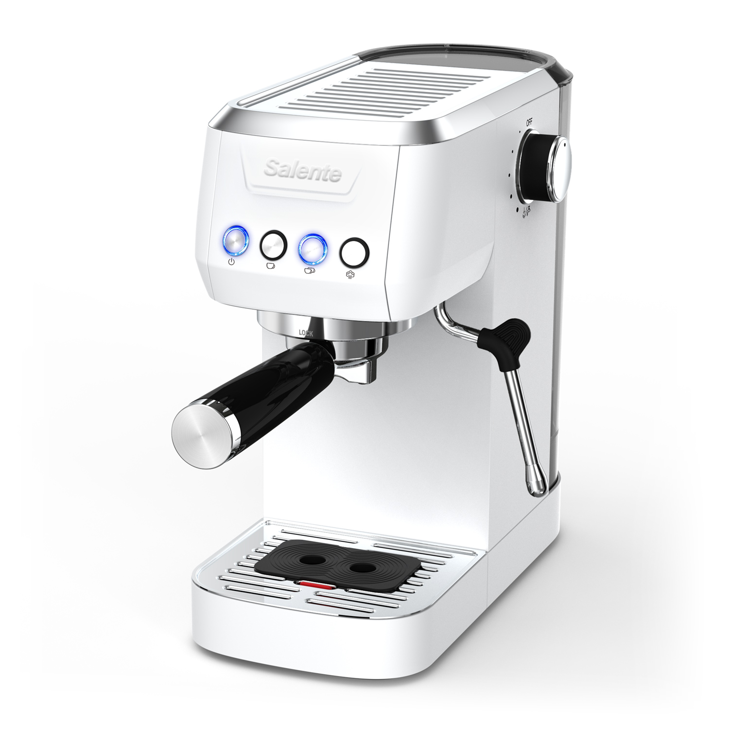 A Salente Coffio karos kávéfőző a praktikus szempontokra is gondol. A levehető 1,3 literes víztartály megkönnyíti a víz utántöltését. A rozsdamentes acél rácsos csepegtetőtálca szintén könnyen eltávolítható, így a tisztítás gyors és egyszerű (egy praktikus jelző mutatja, ha a tálca megtelt). Ráadásul az öblítési funkció biztosítja a kávéfőző problémamentes működését még alkalmankénti használat esetén is.