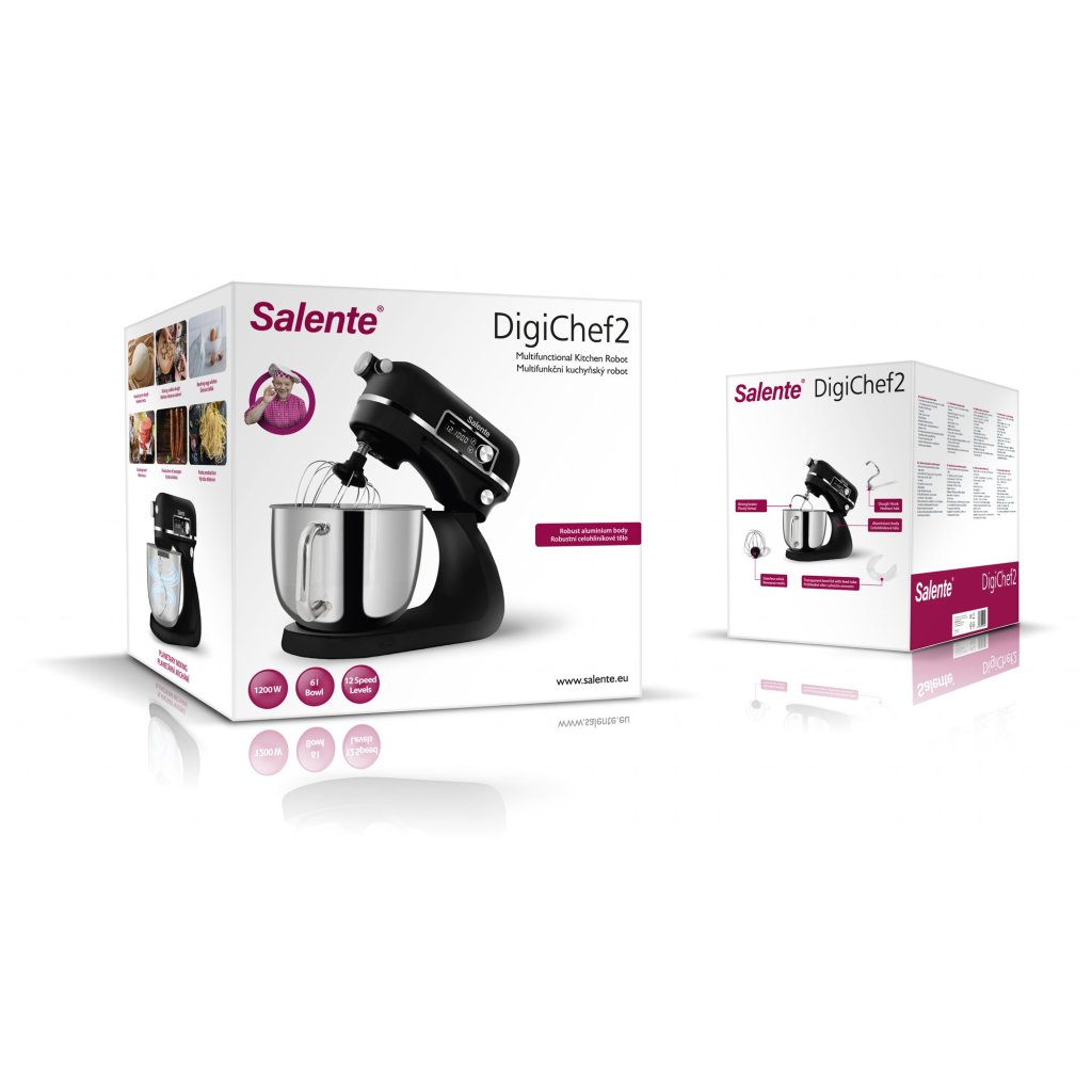 A Salente DigiChef2 nem kispályás. Ez a konyhai robot több funkciót is egyesít magában (dagaszt, kever és habot ver). Megbirkózik mindennel a habos krémek felverésétől a sűrű kenyér- vagy pizzatészta gyúrásáig. Valóban bárki képes kezelni. Ezzel a robottal mester szakáccsá válhat, akinek mindig van egy trükk a tarsolyában.
