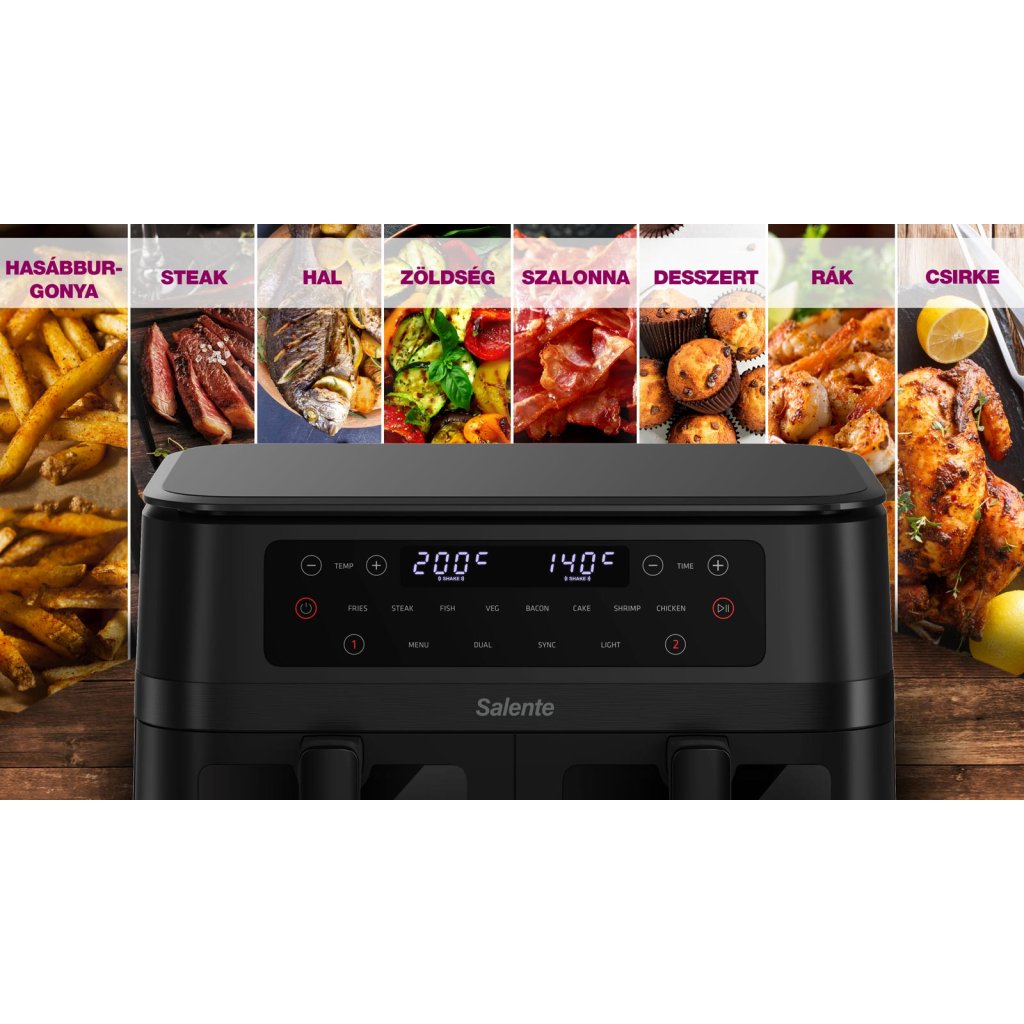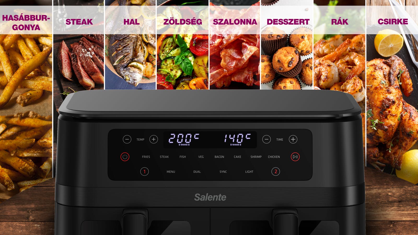 Nem kell tapasztalt séfnek lennie ahhoz, hogy ellenállhatatlan finomságokat készítsen a forrólevegős sütőben. A Salente DoubleAir 8 előre beállított programot kínál, amelyek minden gondot elvesznek - egyszerűen kiválasztja az étel típusát, és a készülék mindent beállít, ahogy kell. Programjai vannak sültkrumplire, steakre, halra, zöldségekre, szalonnára, desszertekre, garnélarákra és csirkére.