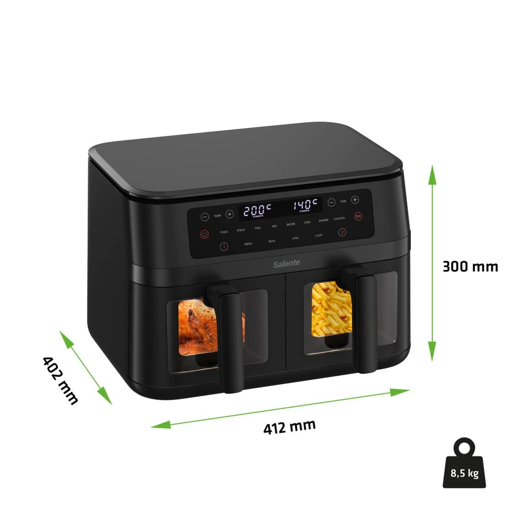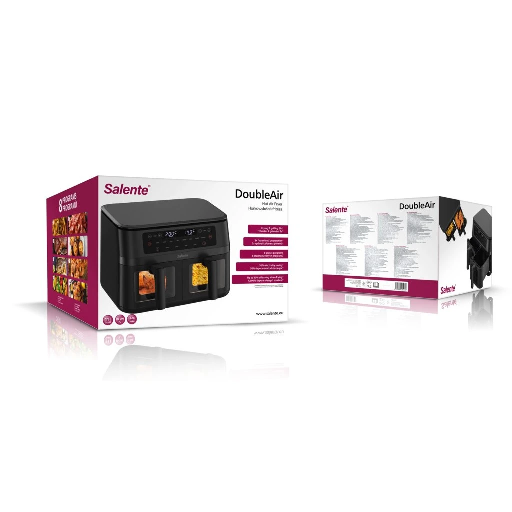 Képzelje el, hogy otthon ropogós sültkrumplit, szaftos steakeket vagy ellenállhatatlan édes desszertet készít, anélkül, hogy aggódnia kellene az egészségtelen zsír vagy a felesleges extra kalóriák miatt. A Salente DoubleAir forrólevegős sütő ezt az álmot valósággá varázsolja. Olajba merítés helyett forró keringő levegőt használ. Ennek köszönhetően ropogós textúrát hoz létre az elkészítendő alapanyagokon, de minimális zsírtartalommal. Képes sütni és grillezni is, és az előnyei közé tartozik a két független sütőkosár (összesen 11 literes kapacitással) két különböző étel egyidejű elkészítéséhez. Egyszerűen olyan helyet varázsol a konyhájából, ahol a bódító ízek és aromák kéz a kézben járnak az egészséges életmóddal.