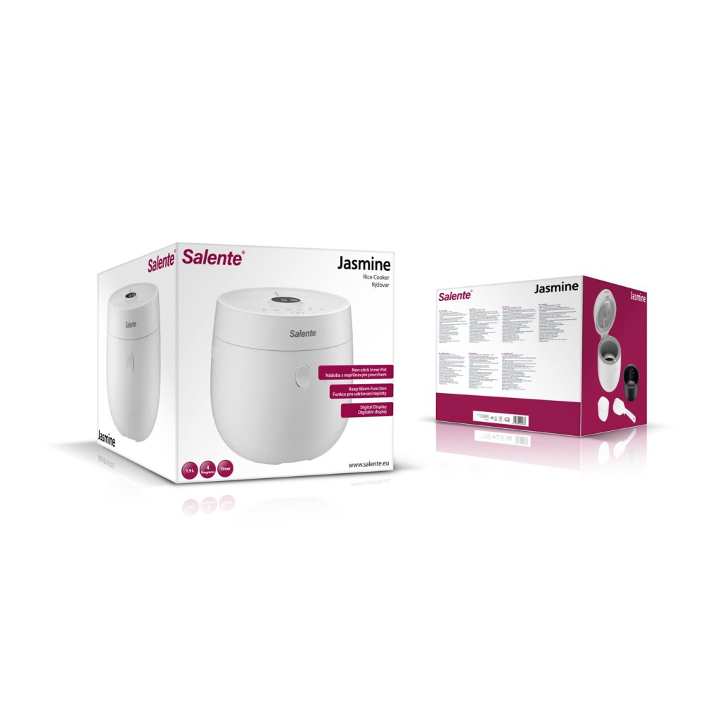 A Salente Jasmine dizájn szempontjából sem vész el a konyhájában. A rizsfőző kompakt testét egy gomb nélküli érintős kezelőpanel egészíti ki, amely áttekinthető, könnyen tisztítható, és nincsenek rajta mechanikus gombok, amelyek idővel elhasználódnának. A nagy kontrasztú digitális LCD kijelző mutatja a hátralévő főzési időt, a melegen tartás időtartamát és a késleltetett indításig hátralévő időt, így minden fontos dologról van áttekintése.